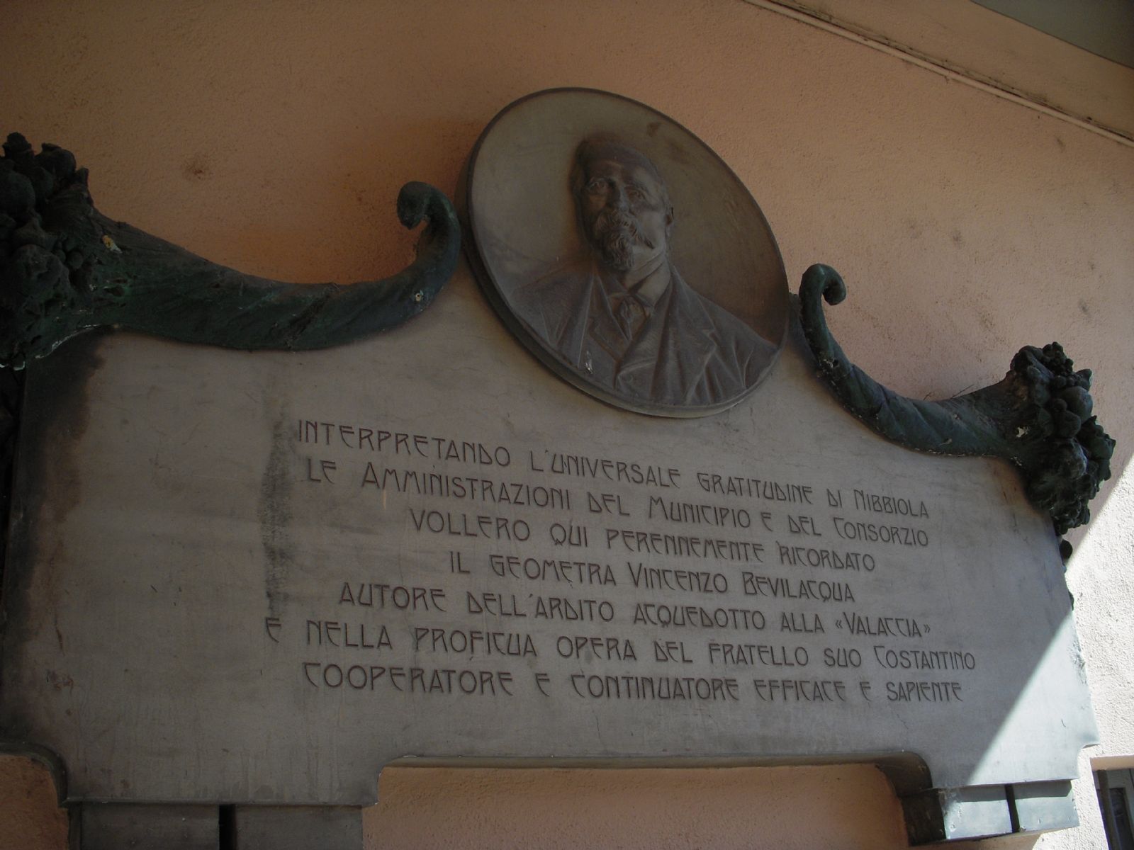 Interpretando l'universale gratitudine di Nibbiola le amministrazioni del municipio e del consorzio vollero qui perennemente ricordato il geometra Vincenzo Bevilacqua autore dell'ardito acquedotto alla "valaccia" e nella sua proficua opera del fratello suo Costantino cooperatore e continuatore efficace e sapiente